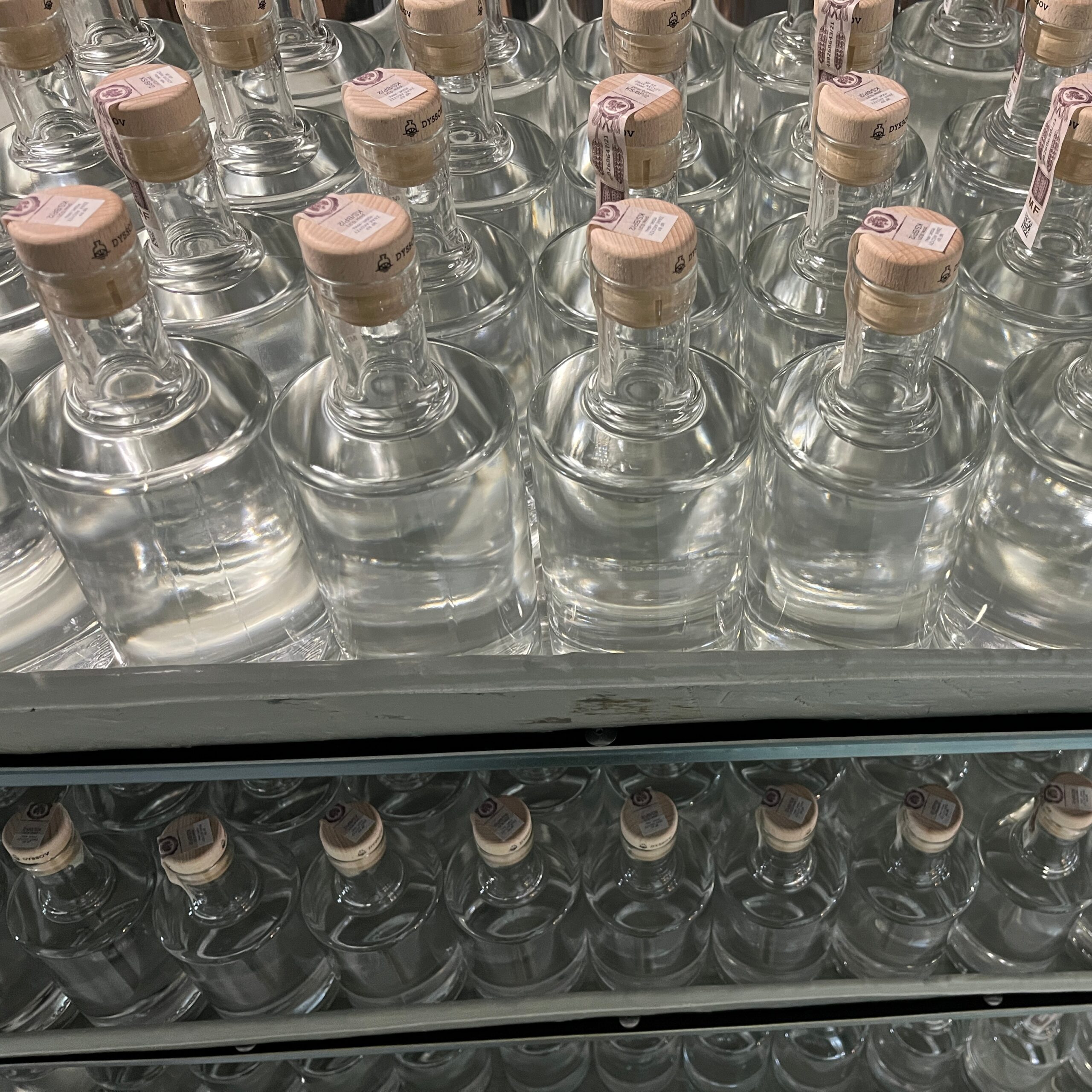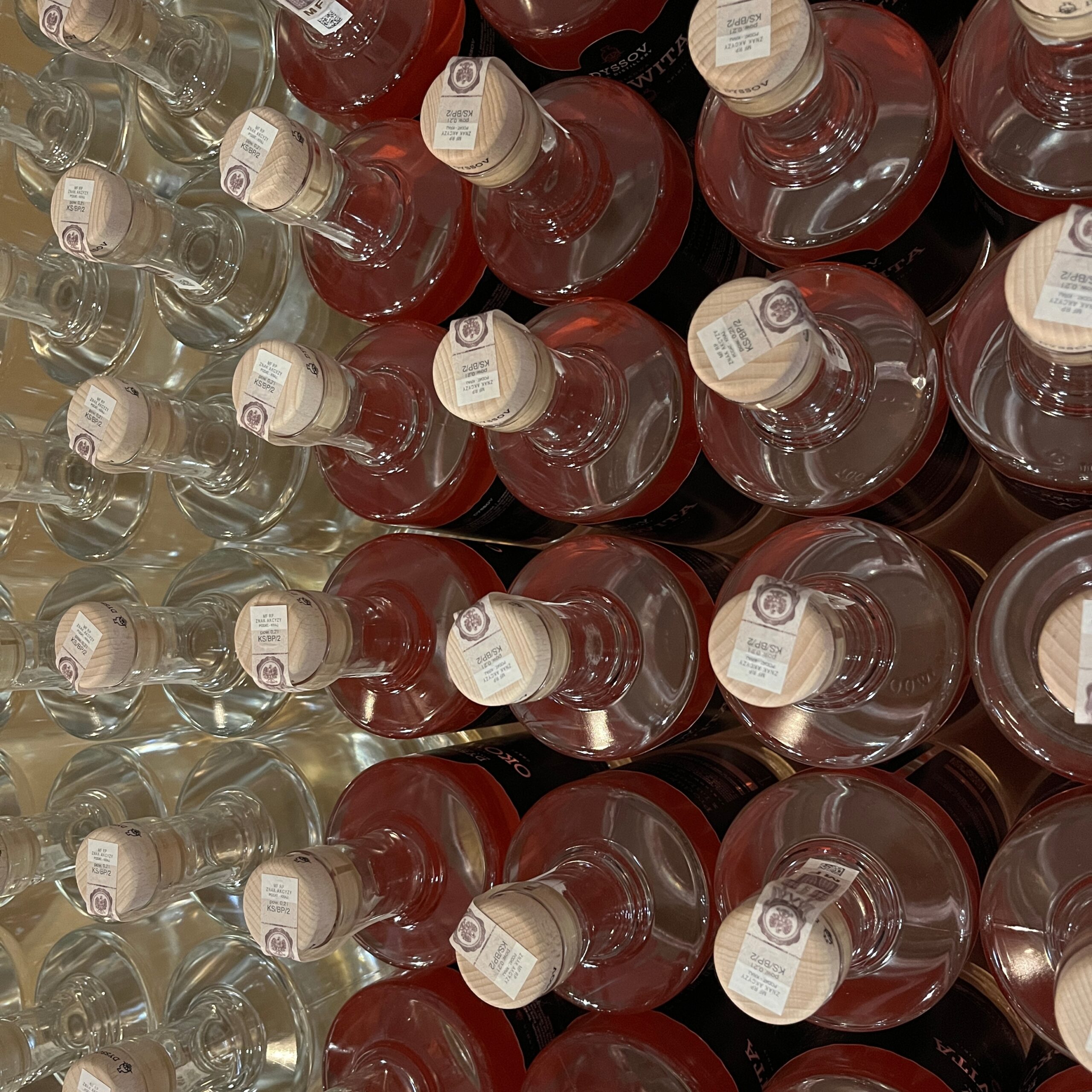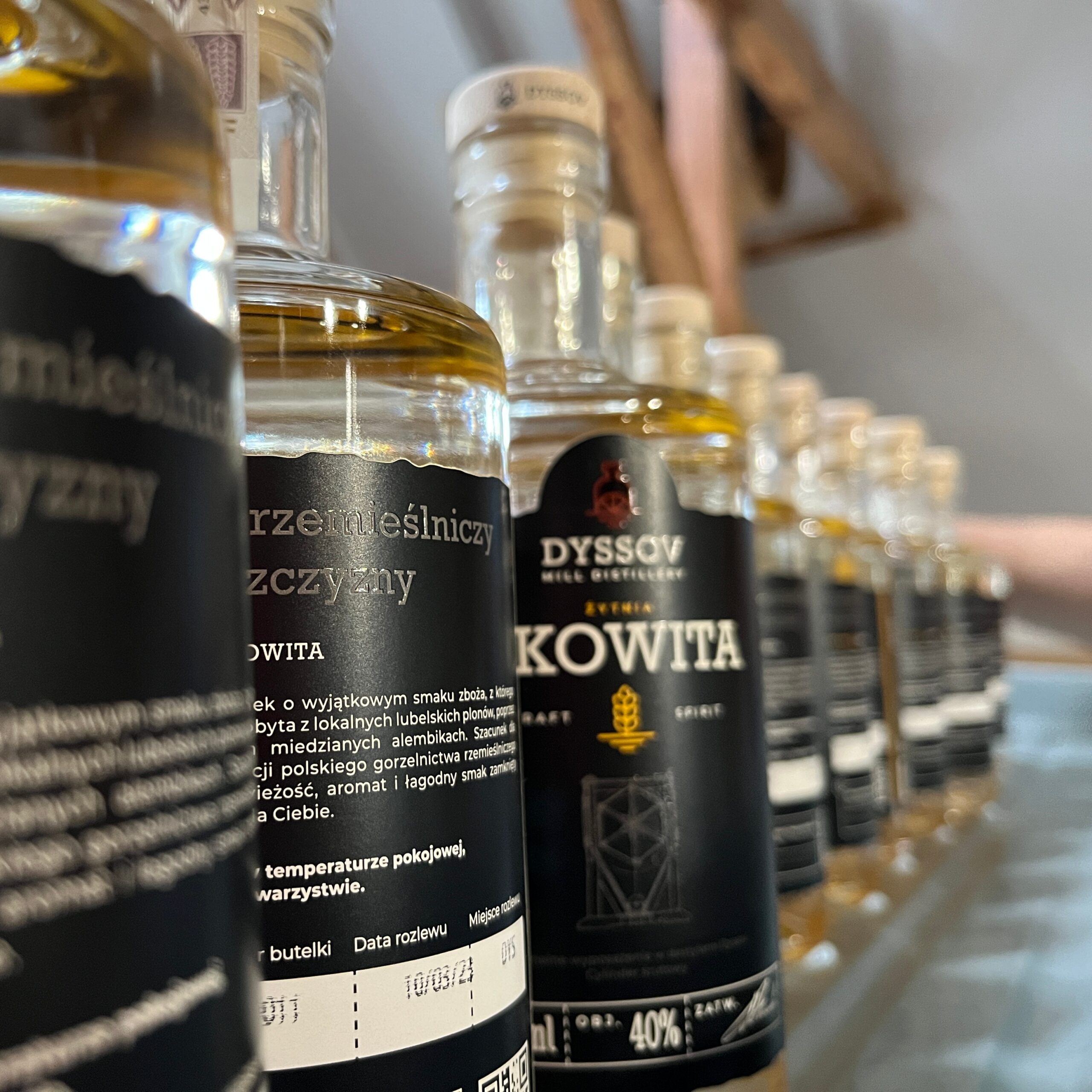 Destylat magazynowany jest w zbiornikach nierdzewnych, z których partiami przekazywany jest do zestawialników. W nich następuje proces zestawienia wysokoprocentowego destylatu z wodą poddaną ówcześnie procesowi odwróconej osmozy. Zabieg ten ma na celu obniżenie zawartości alkoholu do żądanych parametrów, w zależności od rodzaju produktu końcowego zazwyczaj od 40% vol do 43%. Należy wspomnieć, że nie dodajemy żadnych barwników, aromatów zapachowych lub smakowych itp. Po zestawieniu destylatu z wodą otrzymujemy produkt końcowy, jednak nie jest on bezpośrednio butelkowany. Dajemy czas aby nabrał odpowiednich walorów aromatyczno smakowych w procesie leżakowania, podczas którego dodatkowo wykonujemy badania laboratoryjne w celu monitorowania jakości poszczególnych serii. Smak i aromat naszych produktów pochodzi od owocu, zboża, warzywa, z którego powstał. Jeśli surowiec nie był odpowiedniej jakości lub proces fermentacji lub destylacji nie był optymalny, nic już nie jesteśmy w stanie „poprawić”.  Jeśli wszystko przebiegło pomyślnie, po zakończeniu leżakowania, rozlewamy destylat do butelek wykorzystując półautomatyczną nalewarką ciśnieniową. Następnie korkujemy ręcznie butelki oraz etykietujemy. Każda butelka zawiera informacje o serii, dacie i miejscu rozlewu oraz ma unikalny numer. Dzięki temu możecie prześledzić skąd pochodzą surowce, które posłużyły nam do produkcji wódek, okowit, ginu lub innych produktów, które będziecie degustować.